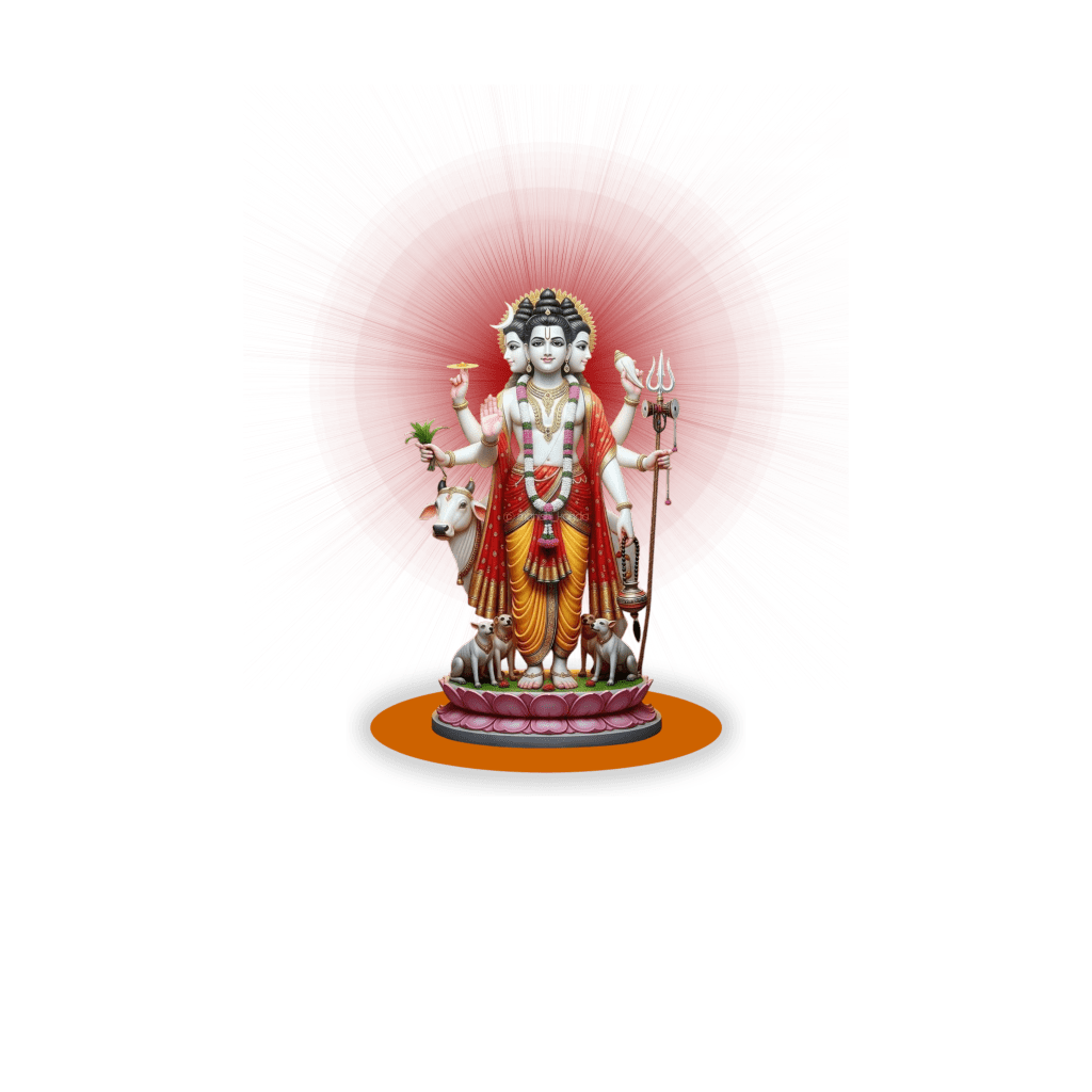 The divine trinity of Brahma, Vishnu, and Maheshwara in one form. Worship of Sri Dattatreya grants spiritual knowledge, detachment, and liberation.